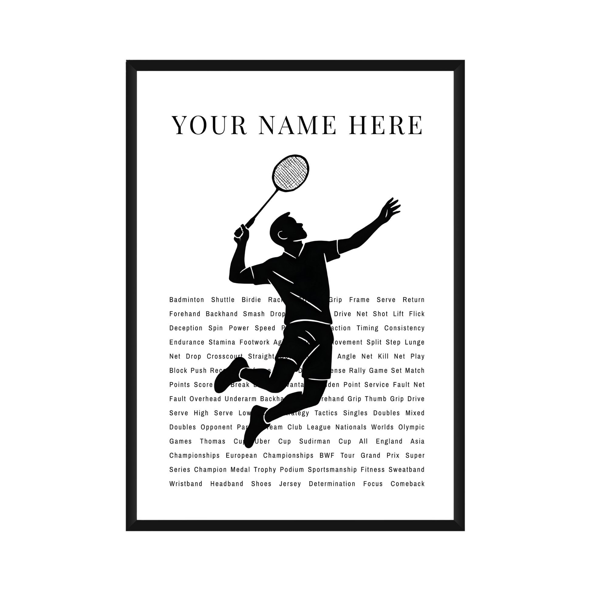 Celebrate your love for badminton with this personalized poster, designed in a stylish newspaper-inspired layout filled with badminton-related words that capture the spirit of the sport. Add your own name, a loved one’s name, or a special message to create a unique, custom art print that’s perfect for your home, office, or as a thoughtful gift for any badminton enthusiast.