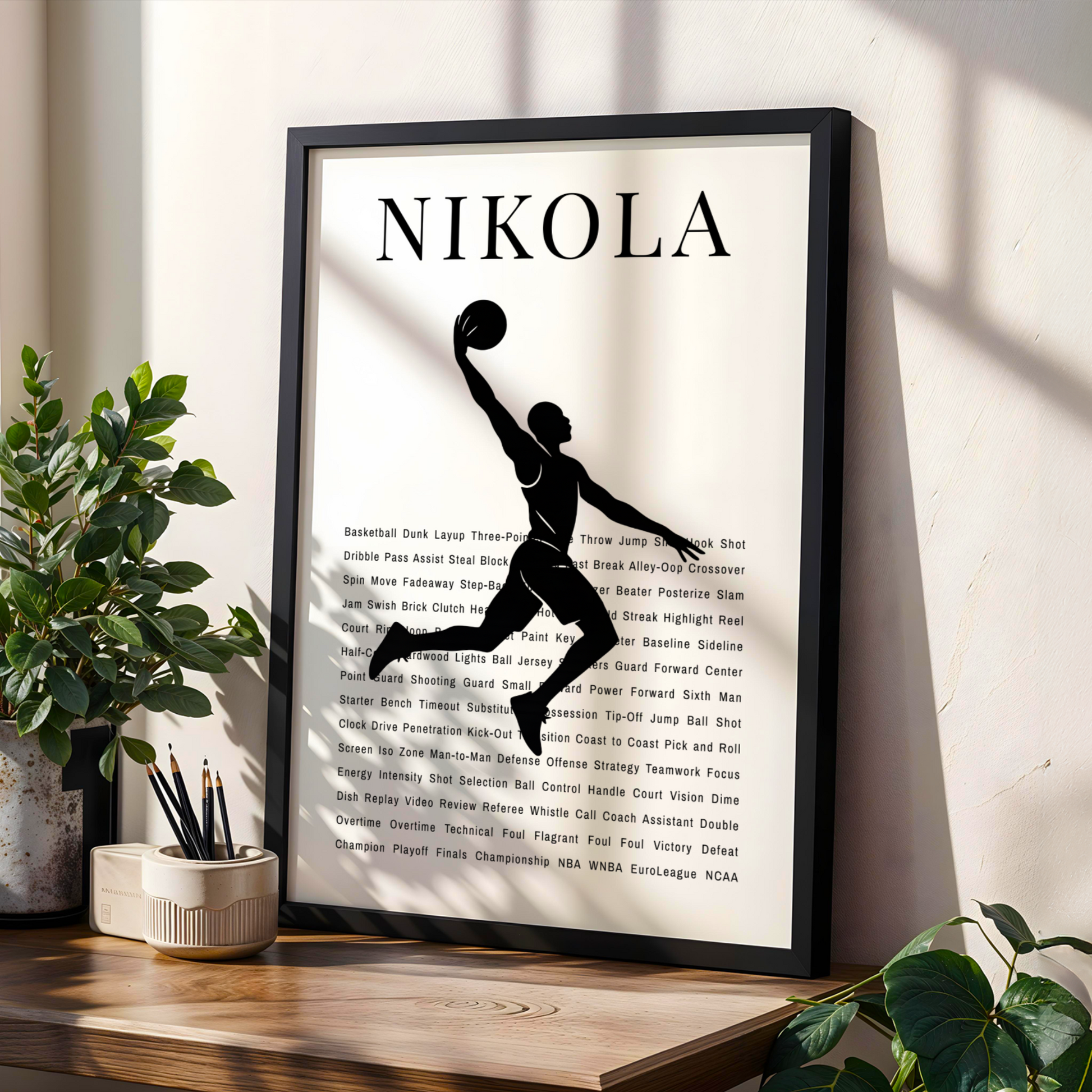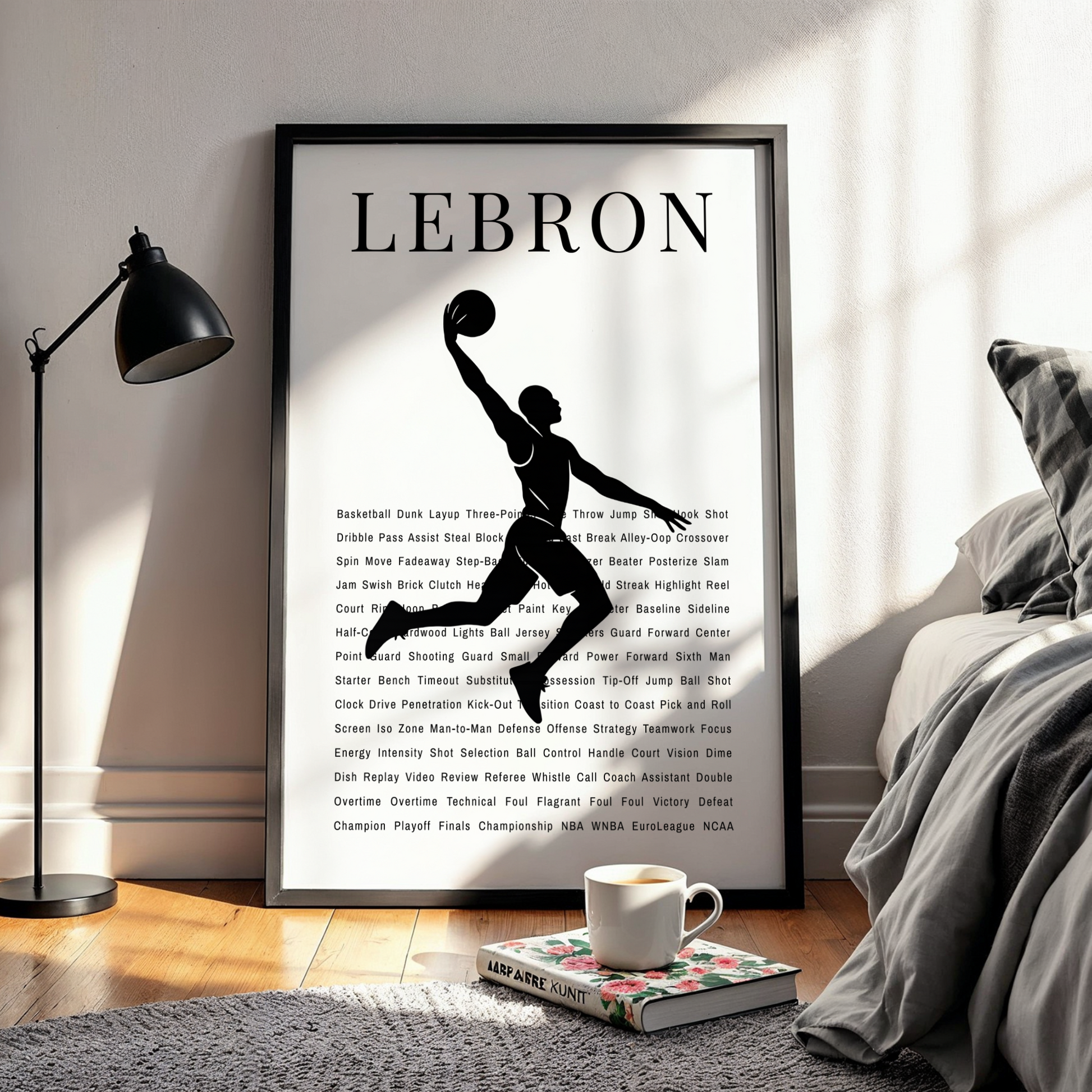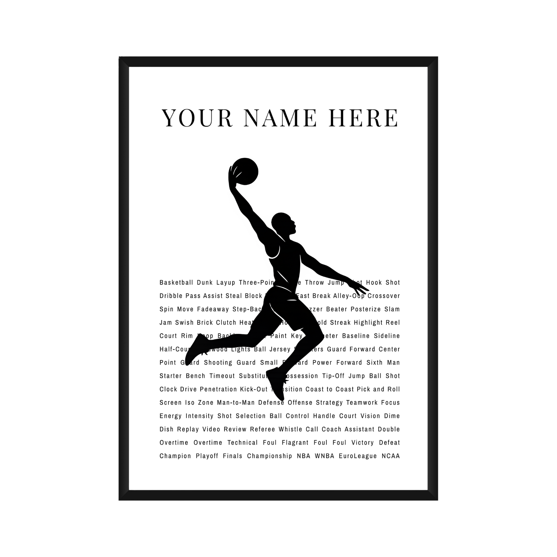 This minimalist word art print has a clean, editorial look reminiscent of a modern newspaper feature, making it a sophisticated and timeless piece for any basketball lover’s wall. It’s an ideal gift for basketball players, coaches, or fans, whether it’s for a birthday, anniversary, or simply to show appreciation.