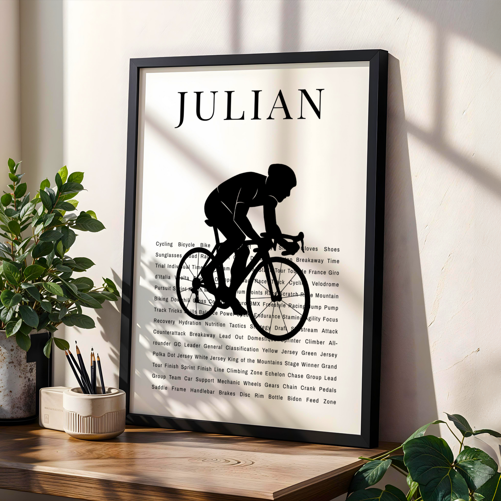 Celebrate your love for cycling with this personalized poster, designed in a stylish newspaper-inspired layout filled with cycling-related words that capture the spirit of the sport. Add your own name, a loved one’s name, or a special message to create a unique, custom art print that’s perfect for your home, office, or as a thoughtful gift for any cycling enthusiast.