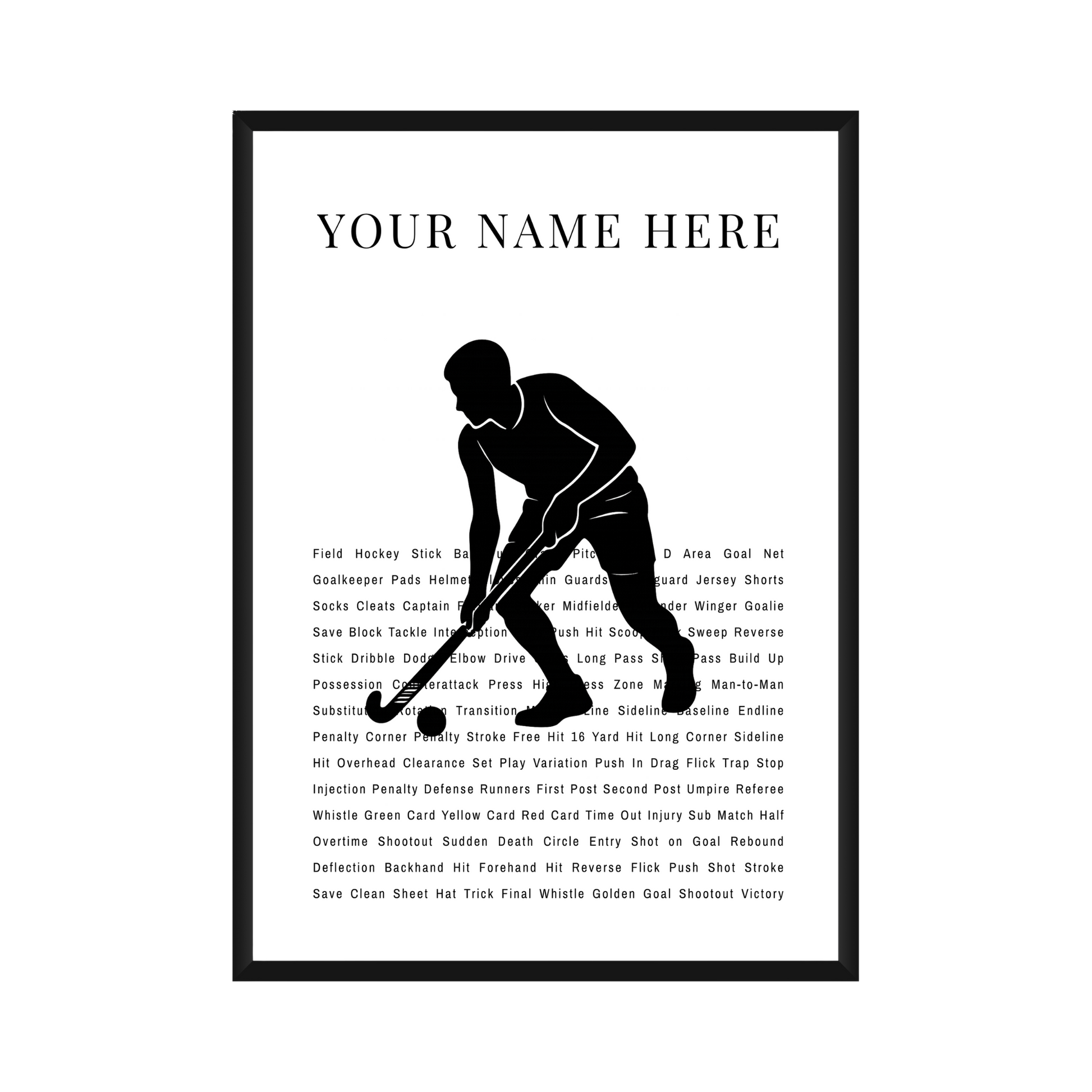 Celebrate your love for field hockey with this personalized poster, designed in a stylish newspaper-inspired layout filled with field hockey-related words that capture the spirit of the sport. Add your own name, a loved one’s name, or a special message to create a unique, custom art print that’s perfect for your home, office, or as a thoughtful gift for any field hockey enthusiast.