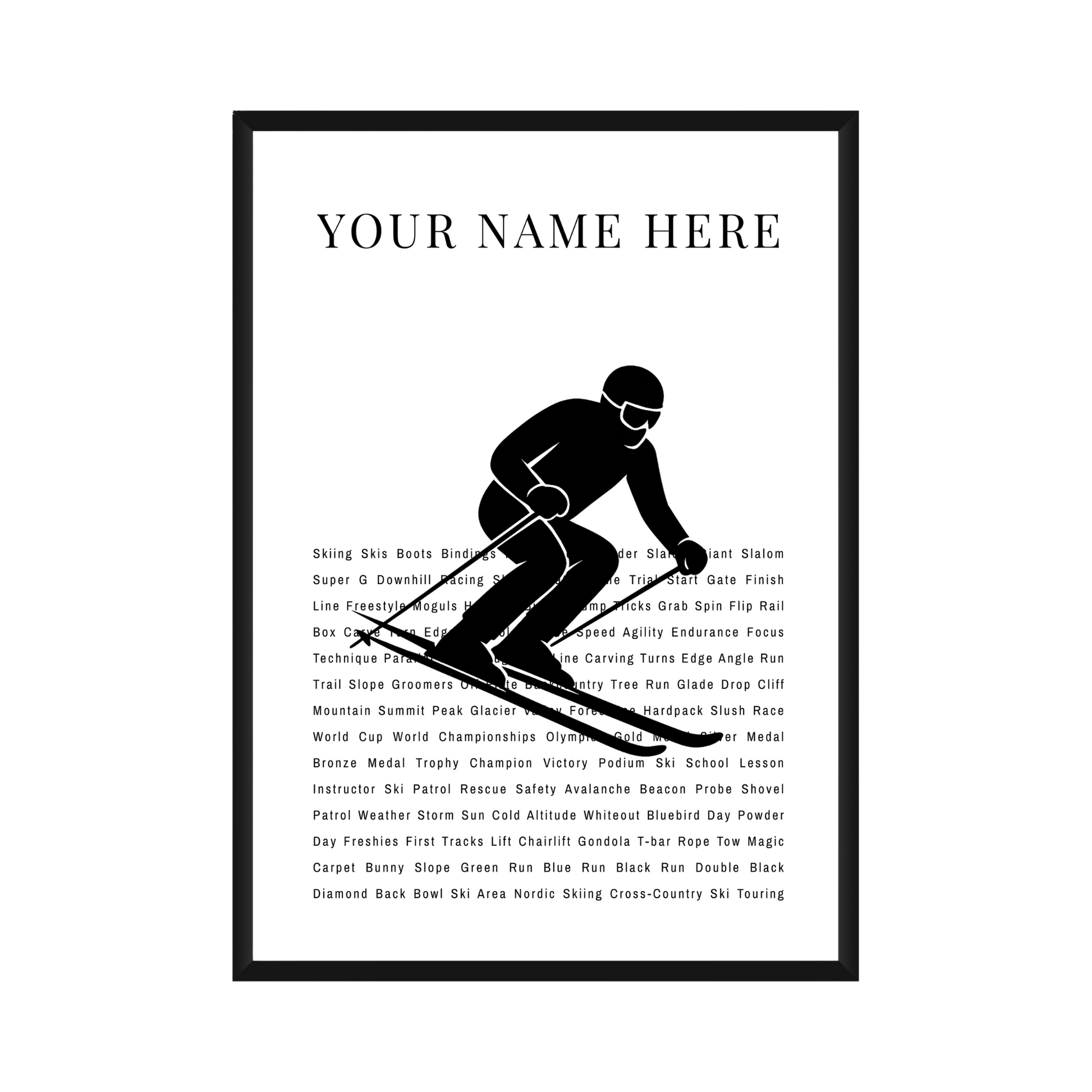 This minimalist word art print has a clean, editorial look reminiscent of a modern newspaper feature, making it a sophisticated and timeless piece for any skiing lover’s wall. It’s an ideal gift for skiers, instructors, or fans, whether it’s for a birthday, anniversary, or simply to show appreciation.