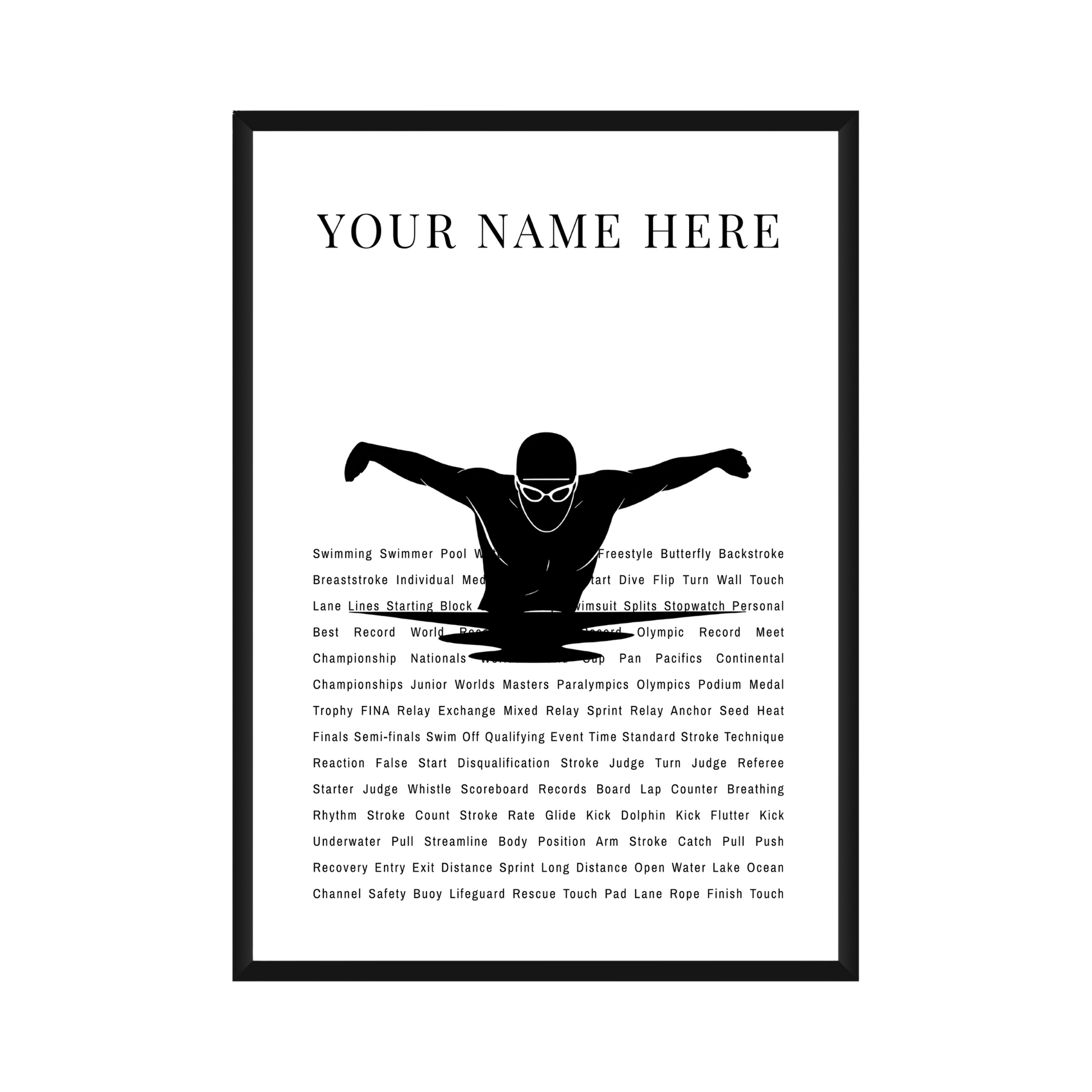 Celebrate your love for swimming with this personalized poster, designed in a stylish newspaper-inspired layout filled with swimming-related words that capture the spirit of the sport. Add your own name, a loved one’s name, or a special message to create a unique, custom art print that’s perfect for your home, office, or as a thoughtful gift for any swimming enthusiast.